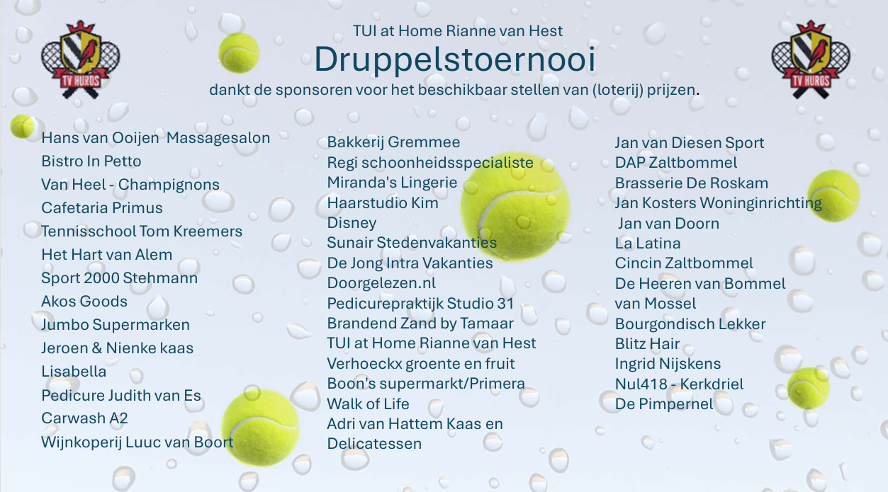 Dit keer was onze hoofdsponsor TUI at Home Rianne van Hest, en daarnaast waren er veel sponsoren die prijzen hebben gedoneerd voor de loterij. We willen ook alle deelnemers, vrijwilligers, toeschouwers bedanken. Zonder jullie was er geen toernooi: geen wedstrijden, hapjes en drankjes, loterijprijzen, etc. Tot begin juni bij het Aardbeientoernooi!