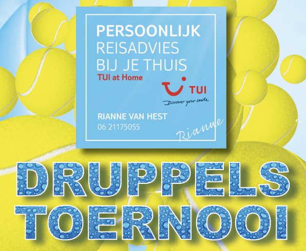 De deadline om in te schrijven voor het TUI at Home Rianne van Hest Druppelstoernooi is verstreken. We hebben maar liefst 140 inschrijvingen en mogen weer meer deelnemers dan vorig jaar verwelkomen op ons complex, waarvan 37 eigen leden. De wedstrijden worden gespeeld van zaterdag 25 oktober met (halve) finales op 1 en 2 november. Dit jaar gaan we op reis langs verschillende landen, waarmee het zonnetje blijft schijnen ook als de druppels vallen en we kunnen genieten van lekkere hapjes van over de hele wereld. In de loterij hebben we veel mooie prijzen, beschikbaar gesteld zijn door onze vele sponsors. Kortom: het belooft weer een mooi toernooi te worden.